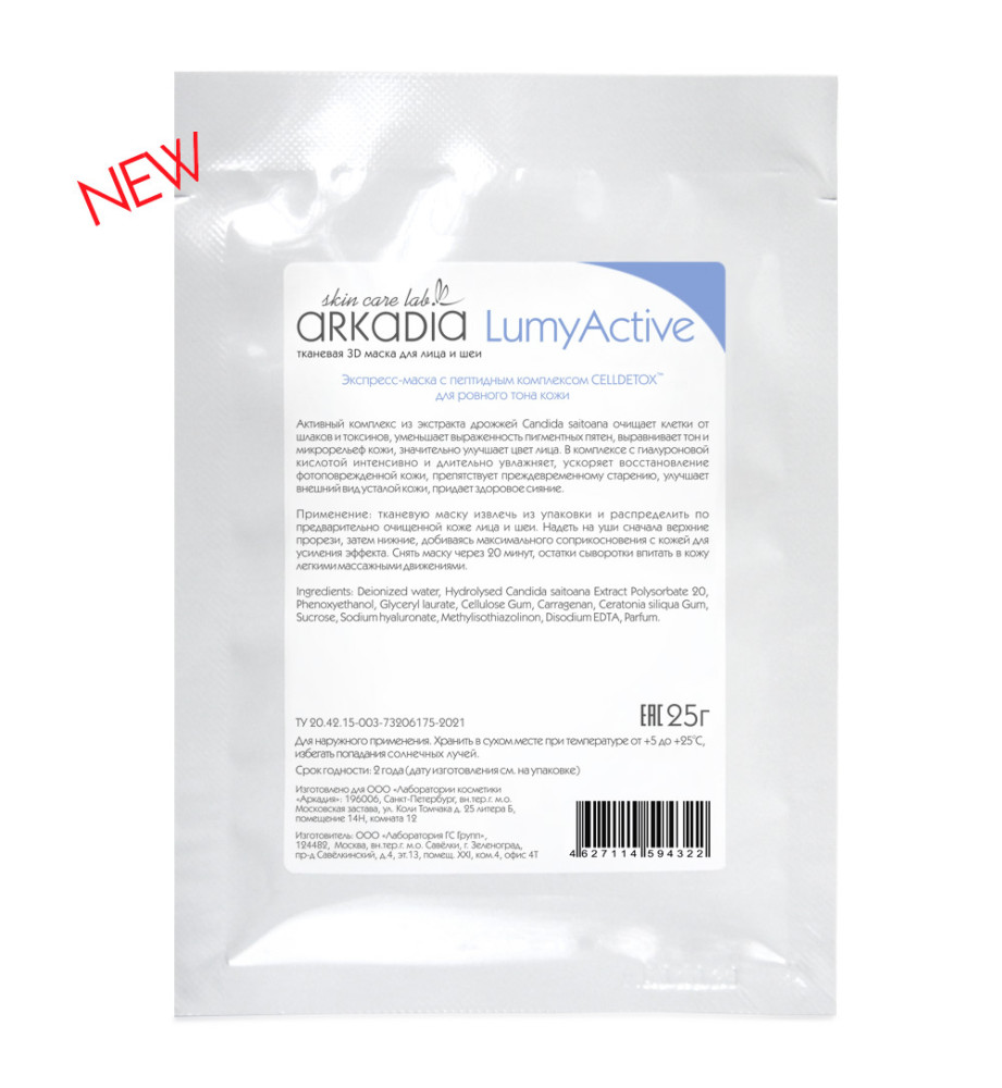 Arkadia Тканевая 3D маска для лица и шеи LumyActive, белая, 5 штук