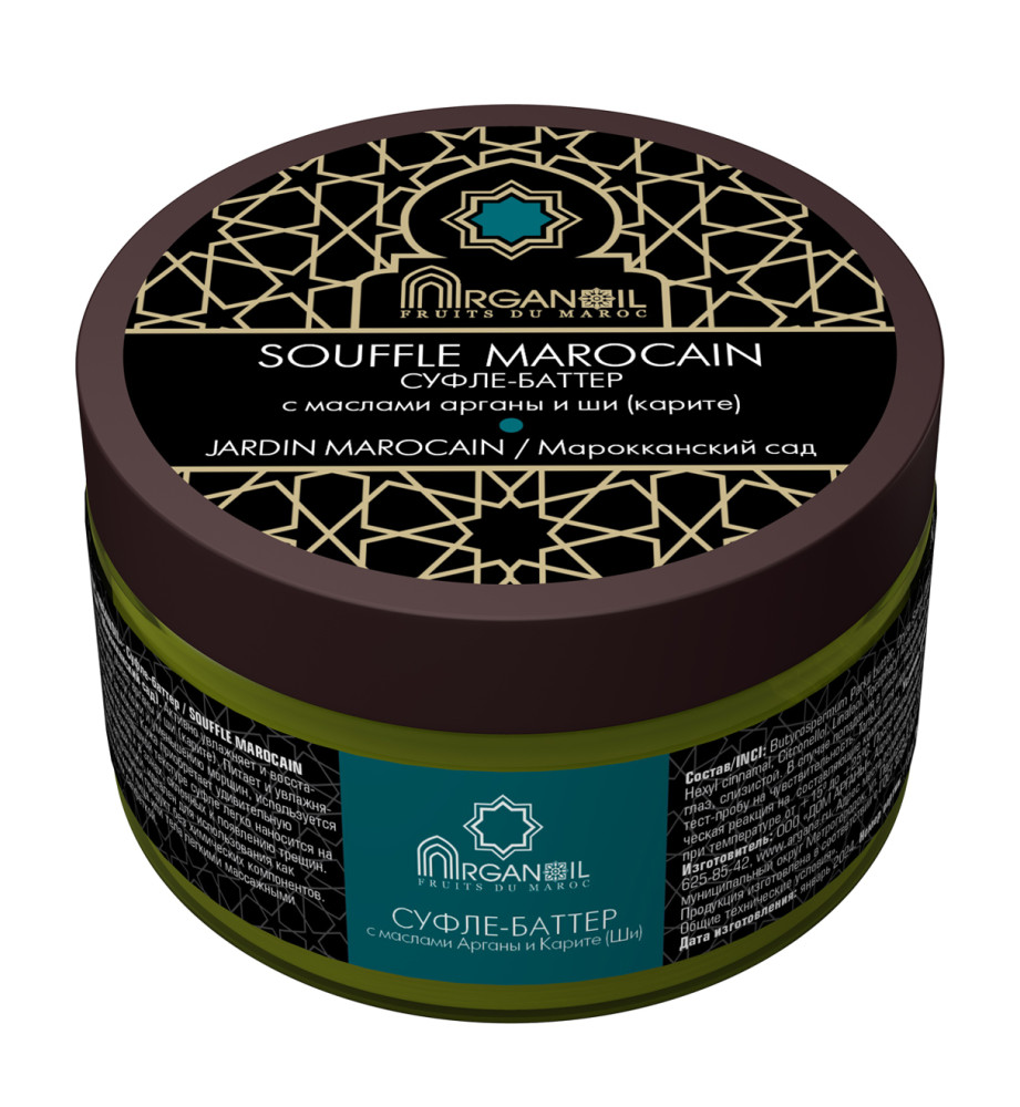 Суфле-баттер (взбитое масло карите с маслом арганы) марки ARGANOIL FRUITS DU MAROC Вербена активно увлажняет и восстанавливает кожу благодаря комплексу ухаживающих масел карите (ши) и арганы.