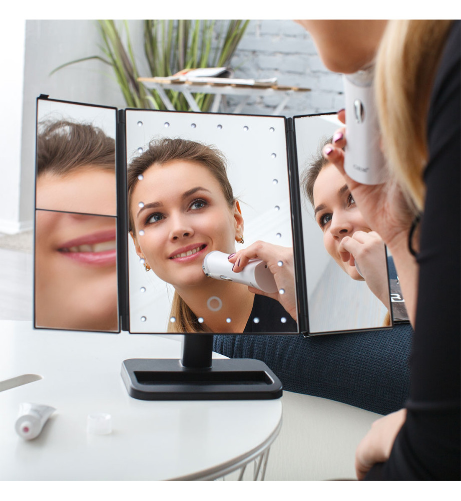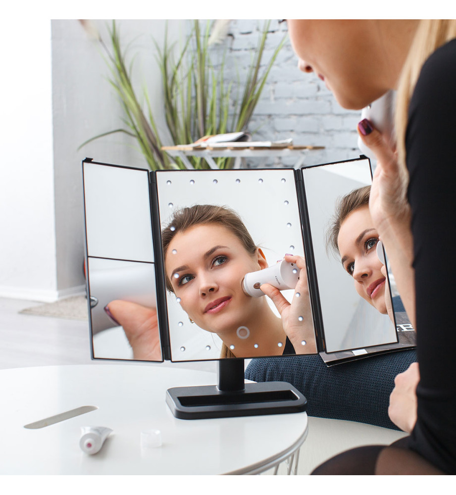 Настоящая мини-студия для макияжа – настольное складное трехстворчатое зеркало с подсветкой. С таким зеркалом вы сможете увидеть себя со всех сторон и создать неповторимый образ за считанные минуты. У зеркала светодиодная подсветка из 24 LED ламп, боковые створки с увеличением в 1, 2 и 3 раза. Удобная подставка легко поворачивается на 180 градусов, позволяя установить необходимый ракурс. В сложенном виде ширина зеркала составляет 19.5 см, в разложенном 38 см. Есть сенсорная кнопка регулирования яркости подсветки на зеркальной панели. Зеркало работает как от USB, так и от батареек.