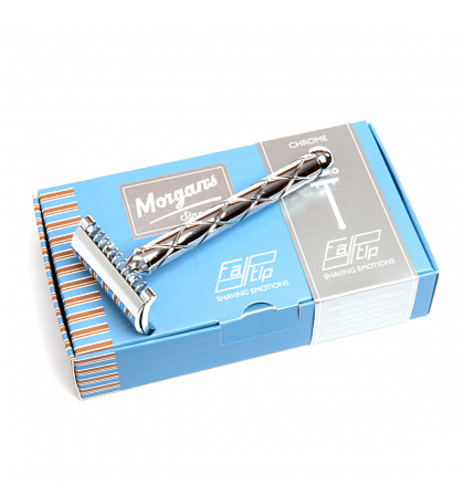 Т-образный станок от Morgan's изготовлен из очень качественной нержавеющей стали и покрыт хромом, что придает ему благородный блеск. Рифление ручки бритвы улучшает сцепление инструмента с рукой во время бритья, что позволяет идеально контролировать процесс и избежать травмирования. Головка с открытым гребнем гарантирует точное и чистое бритье щетины любой длины.